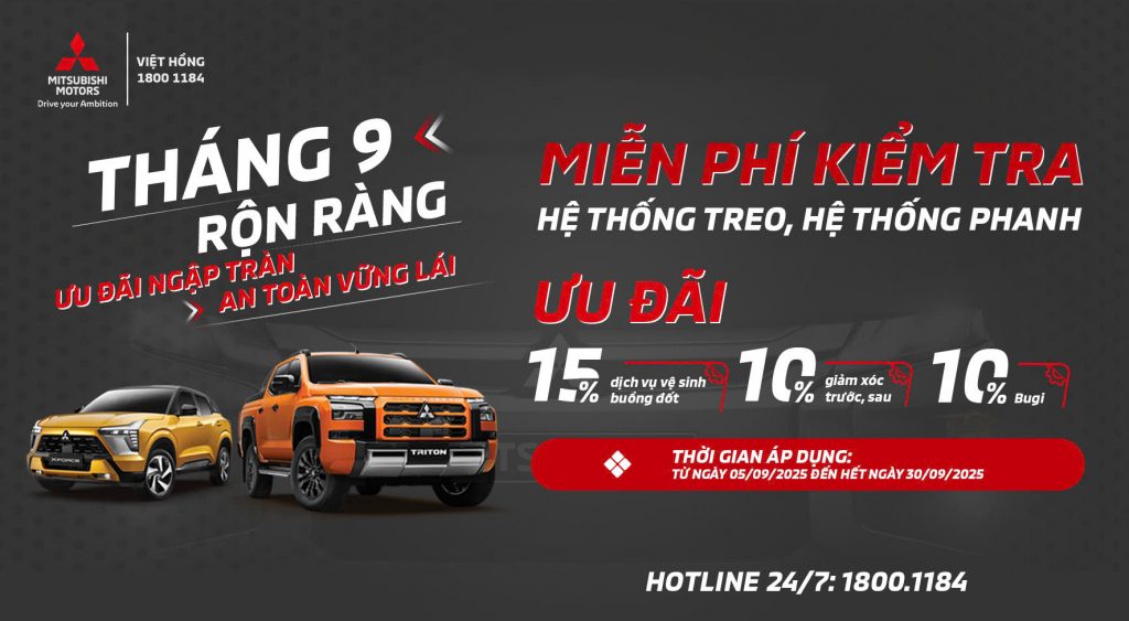 Trung Thu không chỉ là dịp đoàn viên, mà còn là thời điểm để Khách chăm sóc “xế yêu” thật chu đáo, sẵn sàng cho những chuyến đi an toàn, trọn vẹn niềm vui bên gia đình. Chương trình khuyến mại đặc biệt tháng 09 – 10/2025 tại Xưởng Dịch Vụ Mitsubishi Việt Hồng: Giảm […]