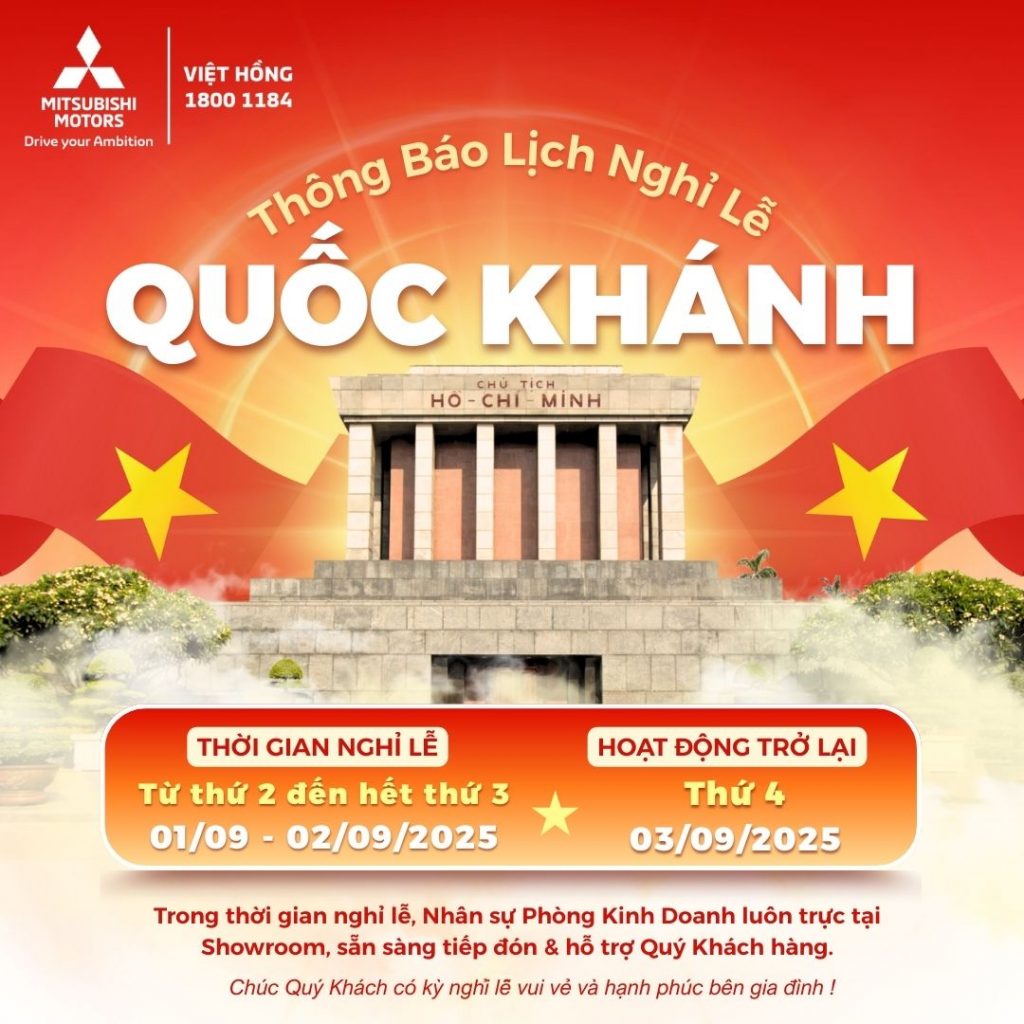 Kính gửi Quý Khách hàng, Quý Đối tác, Hòa chung không khí tự hào kỷ niệm 80 năm Ngày Quốc khánh Nước Cộng hòa Xã hội Chủ nghĩa Việt Nam (02/09/1945 – 02/09/2025), Mitsubishi Motors Việt Hồng trân trọng thông báo lịch nghỉ lễ như sau: Thời gian nghỉ: Từ Thứ 2, ngày 01/09/2025 đến […]